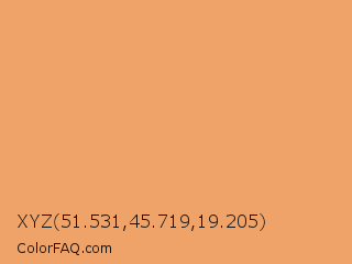 XYZ 51.531,45.719,19.205 Color is a light orange color and the nearest color is Sandy Brown #f4a460. Hex code #f0a368 and RGB value is rgb(240,163,104). In RGB color space, this color is composed of 94% red, 64% green, 41% blue, In CMYK color space, this color is composed of 0% cyan, 32% magenta, 57% yellow , 6% black , In HSL color space, this color has a hue angle of 26° , 82% saturation and 67% lightness.
