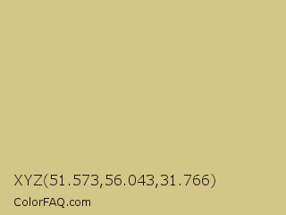 XYZ 51.573,56.043,31.766 Color is a light yellow color and the nearest color is Straw #d4bf8d. Hex code #d3c689 and RGB value is rgb(211,198,137). In RGB color space, this color is composed of 83% red, 78% green, 54% blue, In CMYK color space, this color is composed of 0% cyan, 6% magenta, 35% yellow , 17% black , In HSL color space, this color has a hue angle of 49° , 46% saturation and 68% lightness.