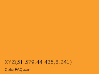XYZ 51.579,44.436,8.241 Color is a normal orange color and the nearest color is Sea Buckthorn #fba129. Hex code #f99d2c and RGB value is rgb(249,157,44). In RGB color space, this color is composed of 98% red, 62% green, 17% blue, In CMYK color space, this color is composed of 0% cyan, 37% magenta, 82% yellow , 2% black , In HSL color space, this color has a hue angle of 33° , 94% saturation and 57% lightness.