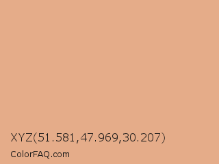 XYZ 51.581,47.969,30.207 Color is a light orange color and the nearest color is Tumbleweed #deaa88. Hex code #e5ac89 and RGB value is rgb(229,172,137). In RGB color space, this color is composed of 90% red, 67% green, 54% blue, In CMYK color space, this color is composed of 0% cyan, 25% magenta, 40% yellow , 10% black , In HSL color space, this color has a hue angle of 23° , 64% saturation and 72% lightness.