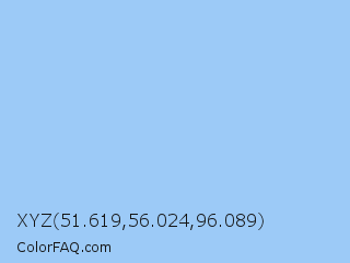 XYZ 51.619,56.024,96.089 Color is a light blue color and the nearest color is Baby Blue Eyes #a1caf1. Hex code #9ccaf7 and RGB value is rgb(156,202,247). In RGB color space, this color is composed of 61% red, 79% green, 97% blue, In CMYK color space, this color is composed of 37% cyan, 18% magenta, 0% yellow , 3% black , In HSL color space, this color has a hue angle of 210° , 85% saturation and 79% lightness.