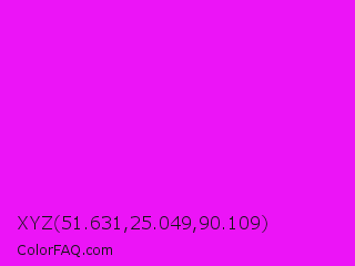 XYZ 51.631,25.049,90.109 Color is a normal magenta color and the nearest color is Phlox #df00ff. Hex code #ec14f7 and RGB value is rgb(236,20,247). In RGB color space, this color is composed of 93% red, 8% green, 97% blue, In CMYK color space, this color is composed of 4% cyan, 92% magenta, 0% yellow , 3% black , In HSL color space, this color has a hue angle of 297° , 93% saturation and 52% lightness.
