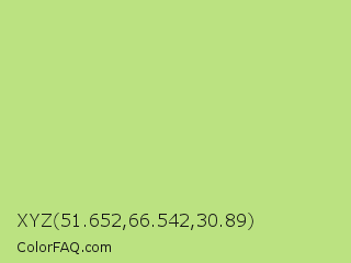 XYZ 51.652,66.542,30.89 Color is a light green color and the nearest color is Yellow Green #c5e17a. Hex code #bbe281 and RGB value is rgb(187,226,129). In RGB color space, this color is composed of 73% red, 89% green, 51% blue, In CMYK color space, this color is composed of 17% cyan, 0% magenta, 43% yellow , 11% black , In HSL color space, this color has a hue angle of 84° , 63% saturation and 70% lightness.