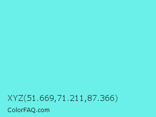 XYZ 51.669,71.211,87.366 Color is a light cyan color and the nearest color is Turquoise Blue #6cdae7. Hex code #6af0e8 and RGB value is rgb(106,240,232). In RGB color space, this color is composed of 42% red, 94% green, 91% blue, In CMYK color space, this color is composed of 56% cyan, 0% magenta, 3% yellow , 6% black , In HSL color space, this color has a hue angle of 176° , 82% saturation and 68% lightness.