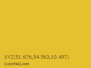 XYZ 51.676,54.563,10.497 Color is a normal yellow color and the nearest color is Meat Brown #e5b73b. Hex code #e5c02f and RGB value is rgb(229,192,47). In RGB color space, this color is composed of 90% red, 75% green, 18% blue, In CMYK color space, this color is composed of 0% cyan, 16% magenta, 79% yellow , 10% black , In HSL color space, this color has a hue angle of 48° , 78% saturation and 54% lightness.