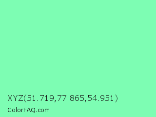 XYZ 51.719,77.865,54.951 Color is a light green color and the nearest color is Aquamarine #7fffd4. Hex code #7dfdb3 and RGB value is rgb(125,253,179). In RGB color space, this color is composed of 49% red, 99% green, 70% blue, In CMYK color space, this color is composed of 51% cyan, 0% magenta, 29% yellow , 1% black , In HSL color space, this color has a hue angle of 145° , 97% saturation and 74% lightness.