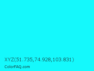XYZ 51.735,74.928,103.831 Color is a normal cyan color and the nearest color is Loeen #15f2fd. Hex code #14f9fc and RGB value is rgb(20,249,252). In RGB color space, this color is composed of 8% red, 98% green, 99% blue, In CMYK color space, this color is composed of 92% cyan, 1% magenta, 0% yellow , 1% black , In HSL color space, this color has a hue angle of 181° , 97% saturation and 53% lightness.