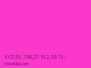 XYZ 51.738,27.512,59.71 Color is a normal magenta color and the nearest color is Razzle Dazzle Rose #ff33cc. Hex code #fa38cc and RGB value is rgb(250,56,204). In RGB color space, this color is composed of 98% red, 22% green, 80% blue, In CMYK color space, this color is composed of 0% cyan, 78% magenta, 18% yellow , 2% black , In HSL color space, this color has a hue angle of 314° , 95% saturation and 60% lightness.