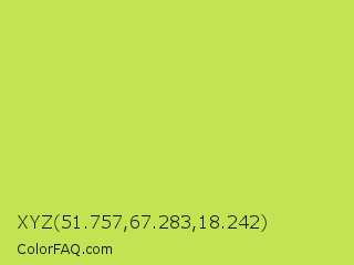 XYZ 51.757,67.283,18.242 Color is a light lime color and the nearest color is June Bud #bdda57. Hex code #c4e352 and RGB value is rgb(196,227,82). In RGB color space, this color is composed of 77% red, 89% green, 32% blue, In CMYK color space, this color is composed of 14% cyan, 0% magenta, 64% yellow , 11% black , In HSL color space, this color has a hue angle of 73° , 72% saturation and 61% lightness.