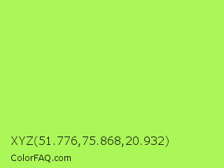 XYZ 51.776,75.868,20.932 Color is a light green color and the nearest color is Inchworm #b2ec5d. Hex code #abf757 and RGB value is rgb(171,247,87). In RGB color space, this color is composed of 67% red, 97% green, 34% blue, In CMYK color space, this color is composed of 31% cyan, 0% magenta, 65% yellow , 3% black , In HSL color space, this color has a hue angle of 89° , 91% saturation and 65% lightness.