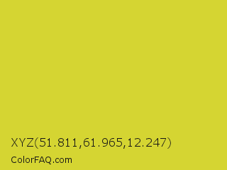 XYZ 51.811,61.965,12.247 Color is a normal yellow color and the nearest color is Pear #d1e231. Hex code #d5d532 and RGB value is rgb(213,213,50). In RGB color space, this color is composed of 84% red, 84% green, 20% blue, In CMYK color space, this color is composed of 0% cyan, 0% magenta, 77% yellow , 16% black , In HSL color space, this color has a hue angle of 60° , 66% saturation and 52% lightness.