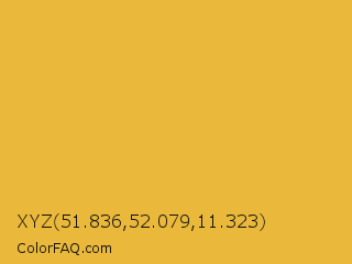 XYZ 51.836,52.079,11.323 Color is a normal orange color and the nearest color is Tulip Tree #eab33b. Hex code #eab83a and RGB value is rgb(234,184,58). In RGB color space, this color is composed of 92% red, 72% green, 23% blue, In CMYK color space, this color is composed of 0% cyan, 21% magenta, 75% yellow , 8% black , In HSL color space, this color has a hue angle of 43° , 81% saturation and 57% lightness.