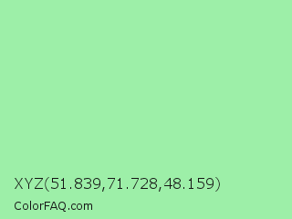 XYZ 51.839,71.728,48.159 Color is a light green color and the nearest color is Teal Deer #99e6b3. Hex code #9defa8 and RGB value is rgb(157,239,168). In RGB color space, this color is composed of 62% red, 94% green, 66% blue, In CMYK color space, this color is composed of 34% cyan, 0% magenta, 30% yellow , 6% black , In HSL color space, this color has a hue angle of 128° , 72% saturation and 78% lightness.