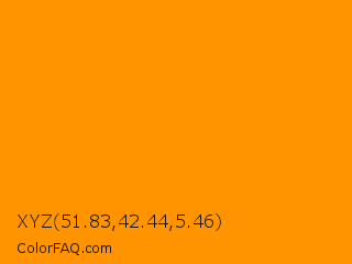 XYZ 51.83,42.44,5.46 Color is a normal orange color and the nearest color is Pizazz #ff9000. Hex code #ff9400 and RGB value is rgb(255,148,0). In RGB color space, this color is composed of 100% red, 58% green, 0% blue, In CMYK color space, this color is composed of 0% cyan, 42% magenta, 100% yellow , 0% black , In HSL color space, this color has a hue angle of 35° , 100% saturation and 50% lightness.