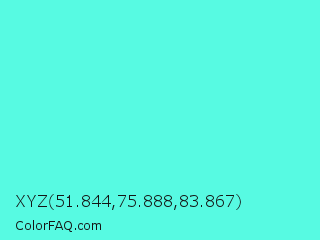 XYZ 51.844,75.888,83.867 Color is a light cyan color and the nearest color is Turquoise Blue #6cdae7. Hex code #57fae2 and RGB value is rgb(87,250,226). In RGB color space, this color is composed of 34% red, 98% green, 89% blue, In CMYK color space, this color is composed of 65% cyan, 0% magenta, 10% yellow , 2% black , In HSL color space, this color has a hue angle of 171° , 94% saturation and 66% lightness.