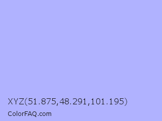 XYZ 51.875,48.291,101.195 Color is a very light blue color and the nearest color is Perano #a9bef2. Hex code #b0b2ff and RGB value is rgb(176,178,255). In RGB color space, this color is composed of 69% red, 70% green, 100% blue, In CMYK color space, this color is composed of 31% cyan, 30% magenta, 0% yellow , 0% black , In HSL color space, this color has a hue angle of 238° , 100% saturation and 85% lightness.