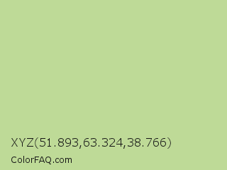 XYZ 51.893,63.324,38.766 Color is a light green color and the nearest color is Pine Glade #c7cd90. Hex code #beda97 and RGB value is rgb(190,218,151). In RGB color space, this color is composed of 75% red, 85% green, 59% blue, In CMYK color space, this color is composed of 13% cyan, 0% magenta, 31% yellow , 15% black , In HSL color space, this color has a hue angle of 85° , 48% saturation and 72% lightness.