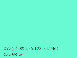 XYZ 51.895,76.128,74.246 Color is a light cyan color and the nearest color is Aquamarine #7fffd4. Hex code #69fad4 and RGB value is rgb(105,250,212). In RGB color space, this color is composed of 41% red, 98% green, 83% blue, In CMYK color space, this color is composed of 58% cyan, 0% magenta, 15% yellow , 2% black , In HSL color space, this color has a hue angle of 164° , 94% saturation and 70% lightness.