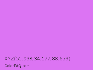 XYZ 51.938,34.177,88.653 Color is a light purple color and the nearest color is Heliotrope #df73ff. Hex code #dc74f3 and RGB value is rgb(220,116,243). In RGB color space, this color is composed of 86% red, 45% green, 95% blue, In CMYK color space, this color is composed of 9% cyan, 52% magenta, 0% yellow , 5% black , In HSL color space, this color has a hue angle of 289° , 84% saturation and 70% lightness.