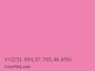 XYZ 51.954,37.705,46.659 Color is a light rose color and the nearest color is Carissma #ea88a8. Hex code #f082b2 and RGB value is rgb(240,130,178). In RGB color space, this color is composed of 94% red, 51% green, 70% blue, In CMYK color space, this color is composed of 0% cyan, 46% magenta, 26% yellow , 6% black , In HSL color space, this color has a hue angle of 334° , 79% saturation and 73% lightness.