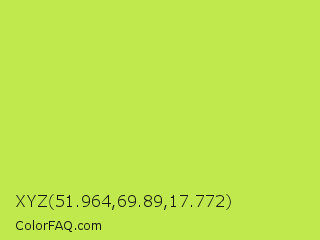 XYZ 51.964,69.89,17.772 Color is a light lime color and the nearest color is June Bud #bdda57. Hex code #bfe94d and RGB value is rgb(191,233,77). In RGB color space, this color is composed of 75% red, 91% green, 30% blue, In CMYK color space, this color is composed of 18% cyan, 0% magenta, 67% yellow , 9% black , In HSL color space, this color has a hue angle of 76° , 78% saturation and 61% lightness.