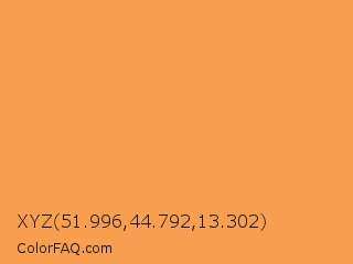XYZ 51.996,44.792,13.302 Color is a light orange color and the nearest color is Tan Hide #fa9d5a. Hex code #f79e4f and RGB value is rgb(247,158,79). In RGB color space, this color is composed of 97% red, 62% green, 31% blue, In CMYK color space, this color is composed of 0% cyan, 36% magenta, 68% yellow , 3% black , In HSL color space, this color has a hue angle of 28° , 91% saturation and 64% lightness.