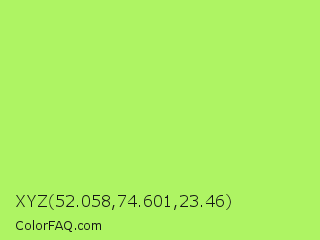 XYZ 52.058,74.601,23.46 Color is a light green color and the nearest color is Inchworm #b2ec5d. Hex code #aef463 and RGB value is rgb(174,244,99). In RGB color space, this color is composed of 68% red, 96% green, 39% blue, In CMYK color space, this color is composed of 29% cyan, 0% magenta, 59% yellow , 4% black , In HSL color space, this color has a hue angle of 89° , 87% saturation and 67% lightness.