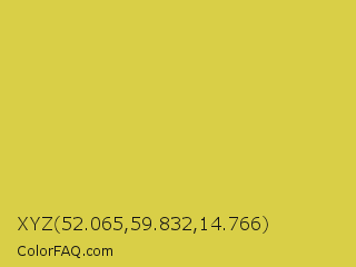 XYZ 52.065,59.832,14.766 Color is a normal yellow color and the nearest color is Wattle #dcd747. Hex code #d9cf47 and RGB value is rgb(217,207,71). In RGB color space, this color is composed of 85% red, 81% green, 28% blue, In CMYK color space, this color is composed of 0% cyan, 5% magenta, 67% yellow , 15% black , In HSL color space, this color has a hue angle of 56° , 66% saturation and 56% lightness.