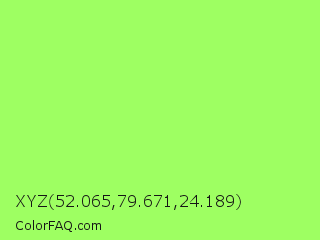 XYZ 52.065,79.671,24.189 Color is a light green color and the nearest color is Inchworm #b2ec5d. Hex code #9eff62 and RGB value is rgb(158,255,98). In RGB color space, this color is composed of 62% red, 100% green, 38% blue, In CMYK color space, this color is composed of 38% cyan, 0% magenta, 62% yellow , 0% black , In HSL color space, this color has a hue angle of 97° , 100% saturation and 69% lightness.