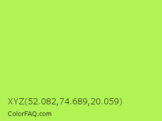 XYZ 52.082,74.689,20.059 Color is a light green color and the nearest color is Inchworm #b2ec5d. Hex code #b1f454 and RGB value is rgb(177,244,84). In RGB color space, this color is composed of 69% red, 96% green, 33% blue, In CMYK color space, this color is composed of 27% cyan, 0% magenta, 66% yellow , 4% black , In HSL color space, this color has a hue angle of 85° , 88% saturation and 64% lightness.