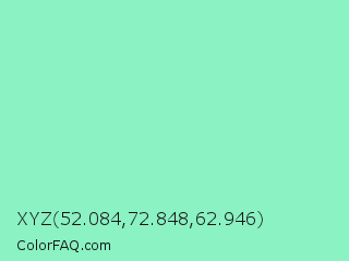 XYZ 52.084,72.848,62.946 Color is a light green color and the nearest color is Algae Green #93dfb8. Hex code #8af2c3 and RGB value is rgb(138,242,195). In RGB color space, this color is composed of 54% red, 95% green, 76% blue, In CMYK color space, this color is composed of 43% cyan, 0% magenta, 19% yellow , 5% black , In HSL color space, this color has a hue angle of 153° , 80% saturation and 75% lightness.