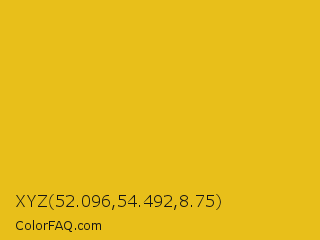 XYZ 52.096,54.492,8.75 Color is a normal yellow color and the nearest color is Gold Tips #deba13. Hex code #e8bf1a and RGB value is rgb(232,191,26). In RGB color space, this color is composed of 91% red, 75% green, 10% blue, In CMYK color space, this color is composed of 0% cyan, 18% magenta, 89% yellow , 9% black , In HSL color space, this color has a hue angle of 48° , 82% saturation and 51% lightness.