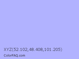 XYZ 52.102,48.408,101.205 Color is a very light blue color and the nearest color is Perano #a9bef2. Hex code #b1b2ff and RGB value is rgb(177,178,255). In RGB color space, this color is composed of 69% red, 70% green, 100% blue, In CMYK color space, this color is composed of 31% cyan, 30% magenta, 0% yellow , 0% black , In HSL color space, this color has a hue angle of 239° , 100% saturation and 85% lightness.