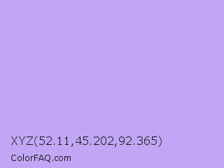 XYZ 52.11,45.202,92.365 Color is a very light violet color and the nearest color is Biloba Flower #b2a1ea. Hex code #c1a6f5 and RGB value is rgb(193,166,245). In RGB color space, this color is composed of 76% red, 65% green, 96% blue, In CMYK color space, this color is composed of 21% cyan, 32% magenta, 0% yellow , 4% black , In HSL color space, this color has a hue angle of 261° , 80% saturation and 81% lightness.