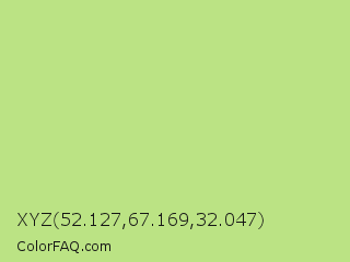 XYZ 52.127,67.169,32.047 Color is a light green color and the nearest color is Yellow Green #c5e17a. Hex code #bbe384 and RGB value is rgb(187,227,132). In RGB color space, this color is composed of 73% red, 89% green, 52% blue, In CMYK color space, this color is composed of 18% cyan, 0% magenta, 42% yellow , 11% black , In HSL color space, this color has a hue angle of 85° , 63% saturation and 70% lightness.