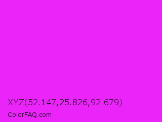 XYZ 52.147,25.826,92.679 Color is a normal magenta color and the nearest color is Phlox #df00ff. Hex code #eb24fa and RGB value is rgb(235,36,250). In RGB color space, this color is composed of 92% red, 14% green, 98% blue, In CMYK color space, this color is composed of 6% cyan, 86% magenta, 0% yellow , 2% black , In HSL color space, this color has a hue angle of 296° , 96% saturation and 56% lightness.