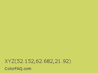 XYZ 52.152,62.682,21.92 Color is a light yellow color and the nearest color is Booger Buster #dde26a. Hex code #ced766 and RGB value is rgb(206,215,102). In RGB color space, this color is composed of 81% red, 84% green, 40% blue, In CMYK color space, this color is composed of 4% cyan, 0% magenta, 53% yellow , 16% black , In HSL color space, this color has a hue angle of 65° , 59% saturation and 62% lightness.