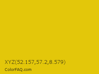 XYZ 52.157,57.2,8.579 Color is a normal yellow color and the nearest color is Citrine #e4d00a. Hex code #e3c70a and RGB value is rgb(227,199,10). In RGB color space, this color is composed of 89% red, 78% green, 4% blue, In CMYK color space, this color is composed of 0% cyan, 12% magenta, 96% yellow , 11% black , In HSL color space, this color has a hue angle of 52° , 92% saturation and 46% lightness.
