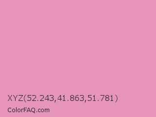 XYZ 52.243,41.863,51.781 Color is a light rose color and the nearest color is Shocking #e292c0. Hex code #e695ba and RGB value is rgb(230,149,186). In RGB color space, this color is composed of 90% red, 58% green, 73% blue, In CMYK color space, this color is composed of 0% cyan, 35% magenta, 19% yellow , 10% black , In HSL color space, this color has a hue angle of 333° , 62% saturation and 74% lightness.