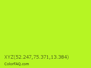 XYZ 52.247,75.371,13.384 Color is a normal lime color and the nearest color is Green Yellow #adff2f. Hex code #b6f523 and RGB value is rgb(182,245,35). In RGB color space, this color is composed of 71% red, 96% green, 14% blue, In CMYK color space, this color is composed of 26% cyan, 0% magenta, 86% yellow , 4% black , In HSL color space, this color has a hue angle of 78° , 91% saturation and 55% lightness.