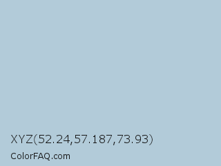 XYZ 52.24,57.187,73.93 Color is a light blue color and the nearest color is Jungle Mist #b4cfd3. Hex code #b2cbd9 and RGB value is rgb(178,203,217). In RGB color space, this color is composed of 70% red, 80% green, 85% blue, In CMYK color space, this color is composed of 18% cyan, 6% magenta, 0% yellow , 15% black , In HSL color space, this color has a hue angle of 202° , 34% saturation and 77% lightness.