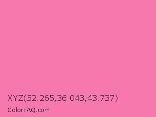 XYZ 52.265,36.043,43.737 Color is a light rose color and the nearest color is Tickle Me Pink Crayola #fc80a5. Hex code #f678ad and RGB value is rgb(246,120,173). In RGB color space, this color is composed of 96% red, 47% green, 68% blue, In CMYK color space, this color is composed of 0% cyan, 51% magenta, 30% yellow , 4% black , In HSL color space, this color has a hue angle of 335° , 88% saturation and 72% lightness.