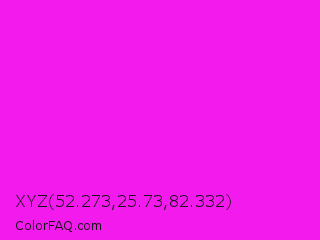 XYZ 52.273,25.73,82.332 Color is a normal magenta color and the nearest color is Hot Magenta #ff1dce. Hex code #f21aed and RGB value is rgb(242,26,237). In RGB color space, this color is composed of 95% red, 10% green, 93% blue, In CMYK color space, this color is composed of 0% cyan, 89% magenta, 2% yellow , 5% black , In HSL color space, this color has a hue angle of 301° , 89% saturation and 53% lightness.