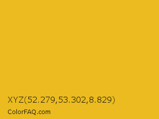 XYZ 52.279,53.302,8.829 Color is a normal yellow color and the nearest color is Deep Lemon #f5c71a. Hex code #ebbb1f and RGB value is rgb(235,187,31). In RGB color space, this color is composed of 92% red, 73% green, 12% blue, In CMYK color space, this color is composed of 0% cyan, 20% magenta, 87% yellow , 8% black , In HSL color space, this color has a hue angle of 46° , 84% saturation and 52% lightness.