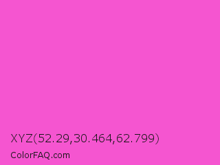 XYZ 52.29,30.464,62.799 Color is a light magenta color and the nearest color is Light Deep Pink #ff5ccd. Hex code #f555d0 and RGB value is rgb(245,85,208). In RGB color space, this color is composed of 96% red, 33% green, 82% blue, In CMYK color space, this color is composed of 0% cyan, 65% magenta, 15% yellow , 4% black , In HSL color space, this color has a hue angle of 314° , 89% saturation and 65% lightness.