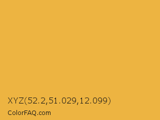 XYZ 52.2,51.029,12.099 Color is a normal orange color and the nearest color is Tulip Tree #eab33b. Hex code #edb441 and RGB value is rgb(237,180,65). In RGB color space, this color is composed of 93% red, 71% green, 25% blue, In CMYK color space, this color is composed of 0% cyan, 24% magenta, 73% yellow , 7% black , In HSL color space, this color has a hue angle of 40° , 83% saturation and 59% lightness.