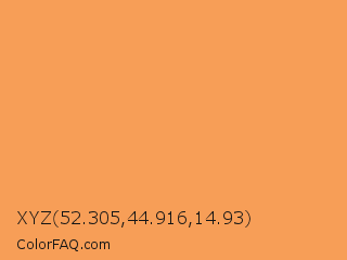 XYZ 52.305,44.916,14.93 Color is a light orange color and the nearest color is Tan Hide #fa9d5a. Hex code #f79e57 and RGB value is rgb(247,158,87). In RGB color space, this color is composed of 97% red, 62% green, 34% blue, In CMYK color space, this color is composed of 0% cyan, 36% magenta, 65% yellow , 3% black , In HSL color space, this color has a hue angle of 27° , 91% saturation and 65% lightness.