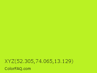 XYZ 52.305,74.065,13.129 Color is a normal lime color and the nearest color is Green Yellow #adff2f. Hex code #baf223 and RGB value is rgb(186,242,35). In RGB color space, this color is composed of 73% red, 95% green, 14% blue, In CMYK color space, this color is composed of 23% cyan, 0% magenta, 86% yellow , 5% black , In HSL color space, this color has a hue angle of 76° , 89% saturation and 54% lightness.
