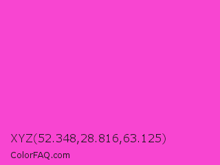 XYZ 52.348,28.816,63.125 Color is a light magenta color and the nearest color is Purple Pizzazz #fe4eda. Hex code #f845d1 and RGB value is rgb(248,69,209). In RGB color space, this color is composed of 97% red, 27% green, 82% blue, In CMYK color space, this color is composed of 0% cyan, 72% magenta, 16% yellow , 3% black , In HSL color space, this color has a hue angle of 313° , 93% saturation and 62% lightness.