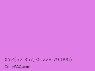XYZ 52.357,36.228,79.096 Color is a light magenta color and the nearest color is Lavender Magenta #ee82ee. Hex code #e07de6 and RGB value is rgb(224,125,230). In RGB color space, this color is composed of 88% red, 49% green, 90% blue, In CMYK color space, this color is composed of 3% cyan, 46% magenta, 0% yellow , 10% black , In HSL color space, this color has a hue angle of 297° , 68% saturation and 70% lightness.
